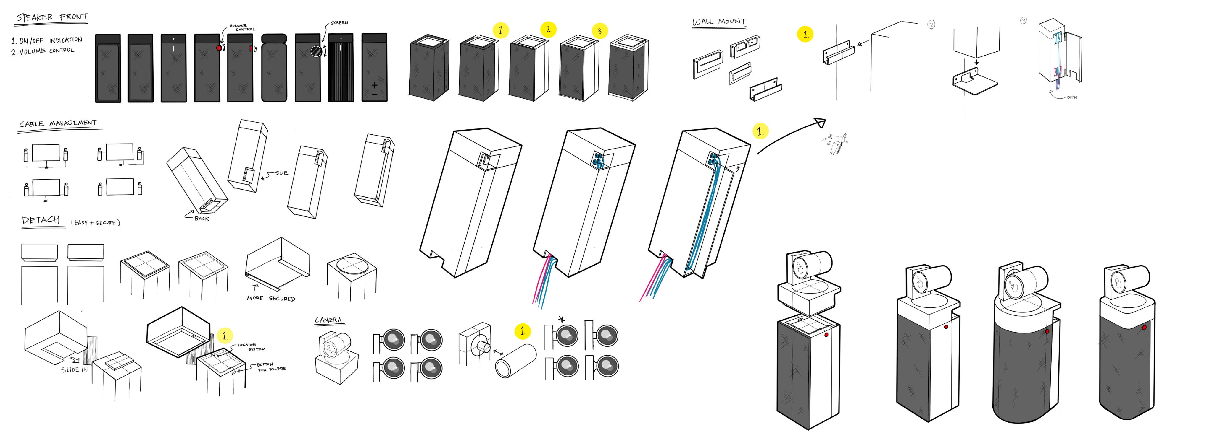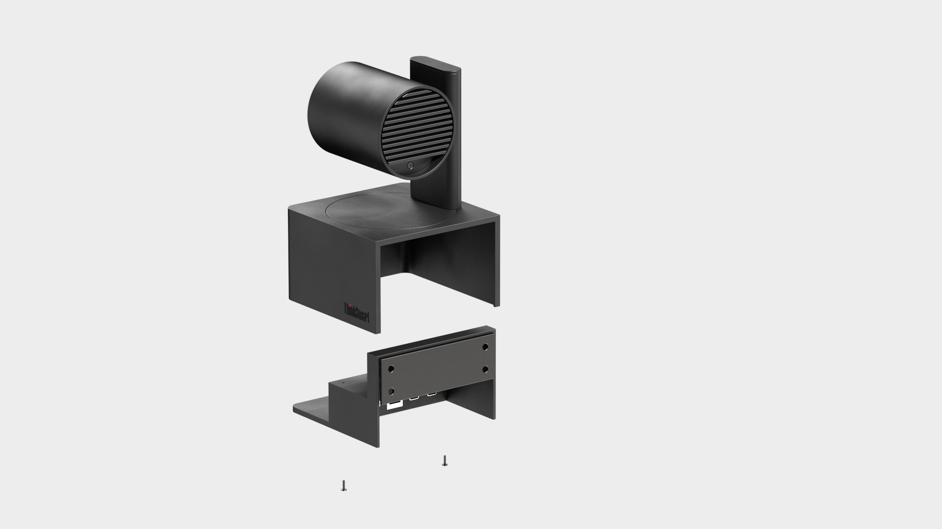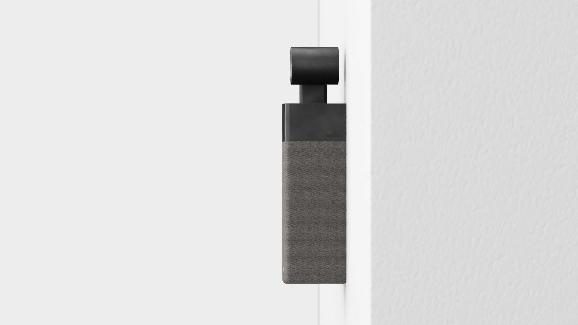 Works as a camera alone or with the speaker, sharing a single cable exit. Ideally routed through the wall; if not, the cable exits horizontally from the camera base and runs down the back of the speaker—optimized for both separate and combined setups.