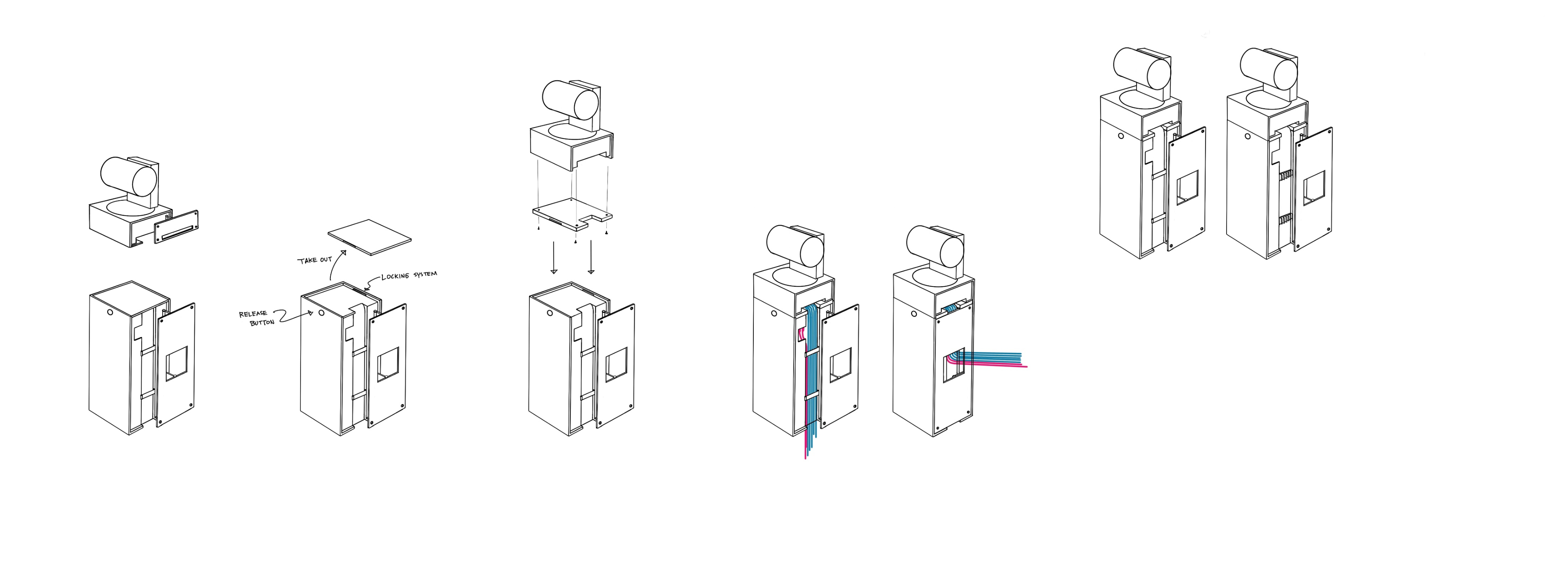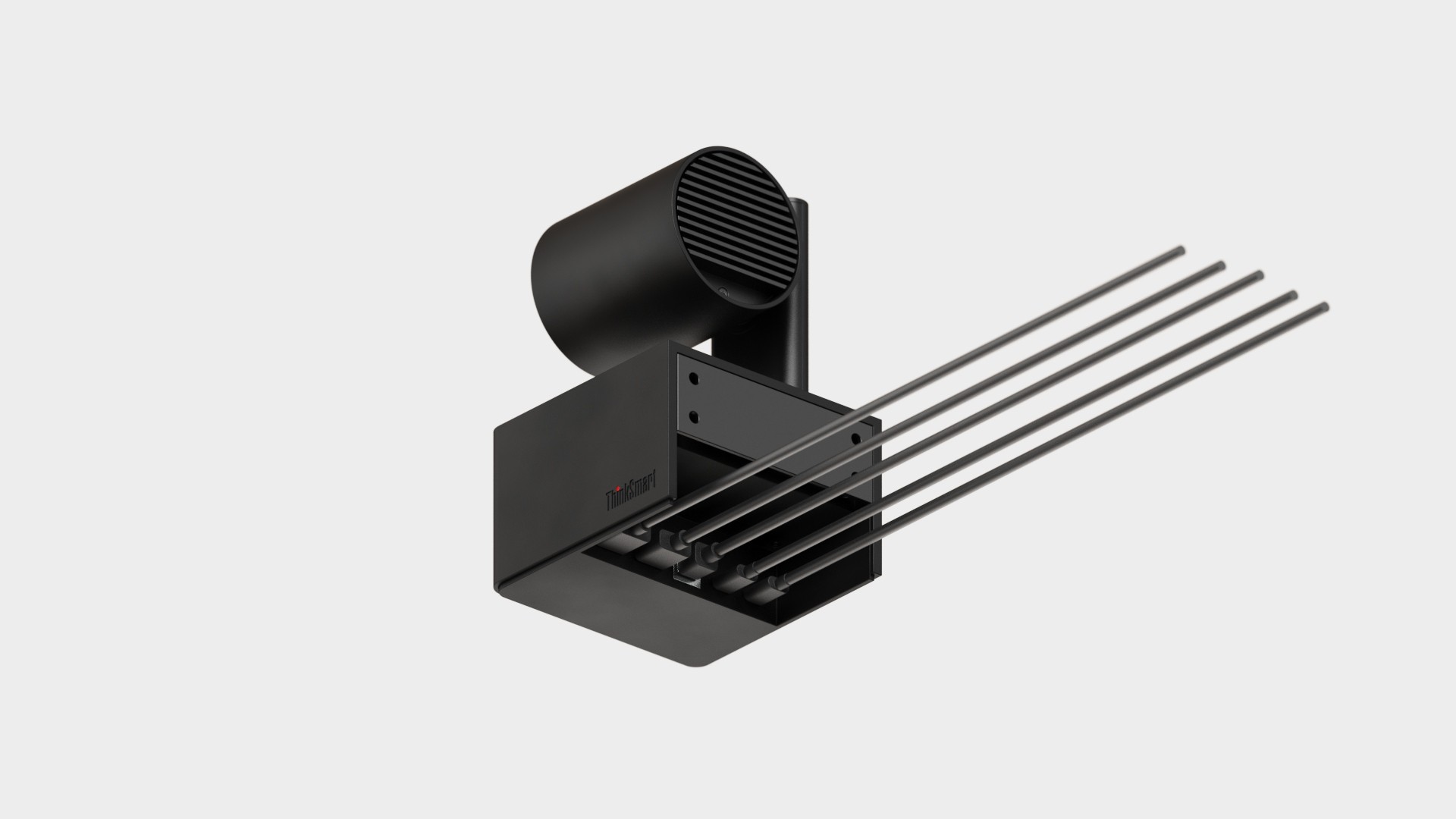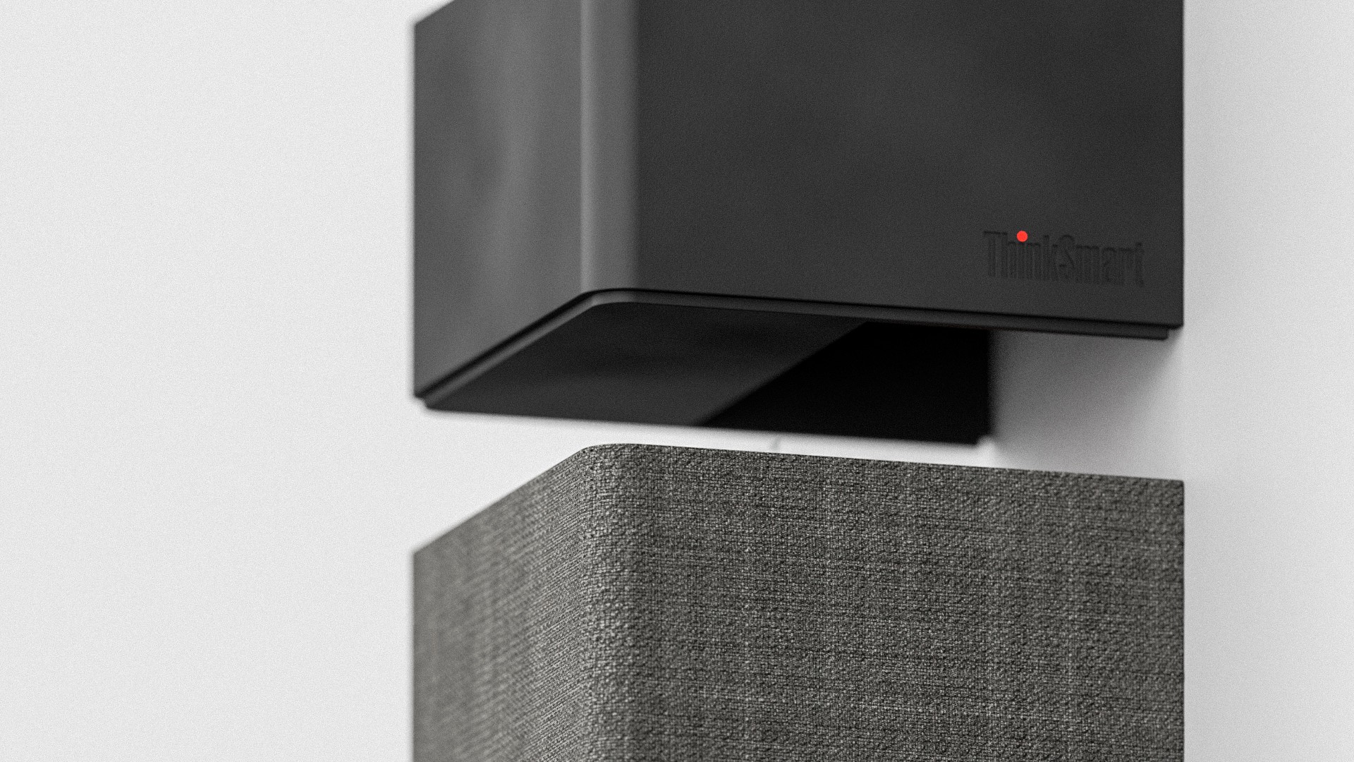 Works as a camera alone or with the speaker, sharing a single cable exit. Ideally routed through the wall; if not, the cable exits horizontally from the camera base and runs down the back of the speaker—optimized for both separate and combined setups.
