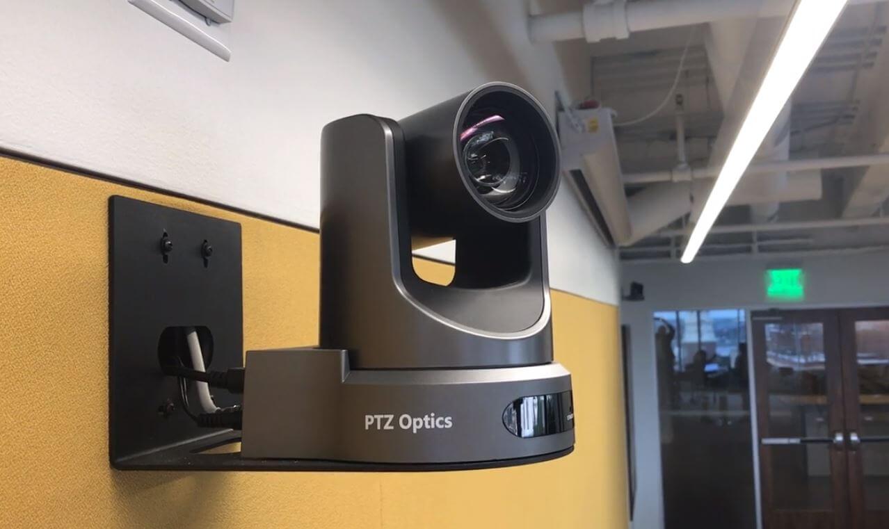 a PTZ camera with a speaker for large modern conference rooms that is easy to install and maintain.