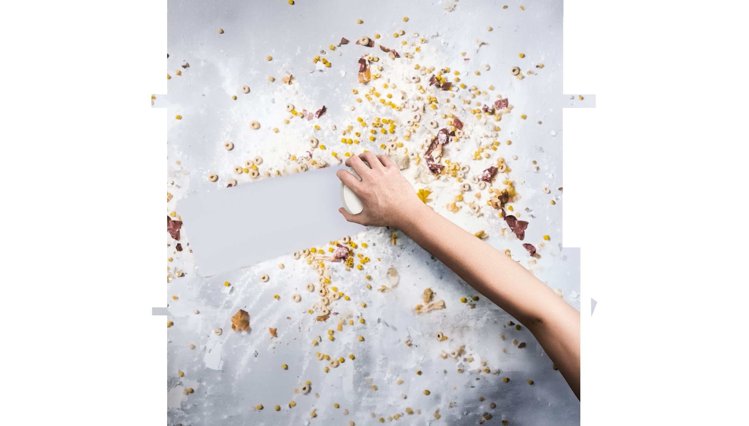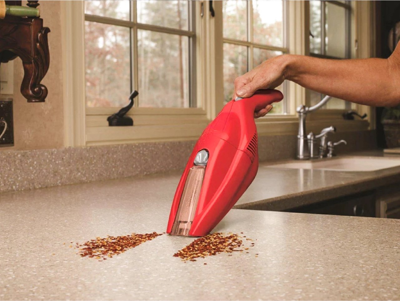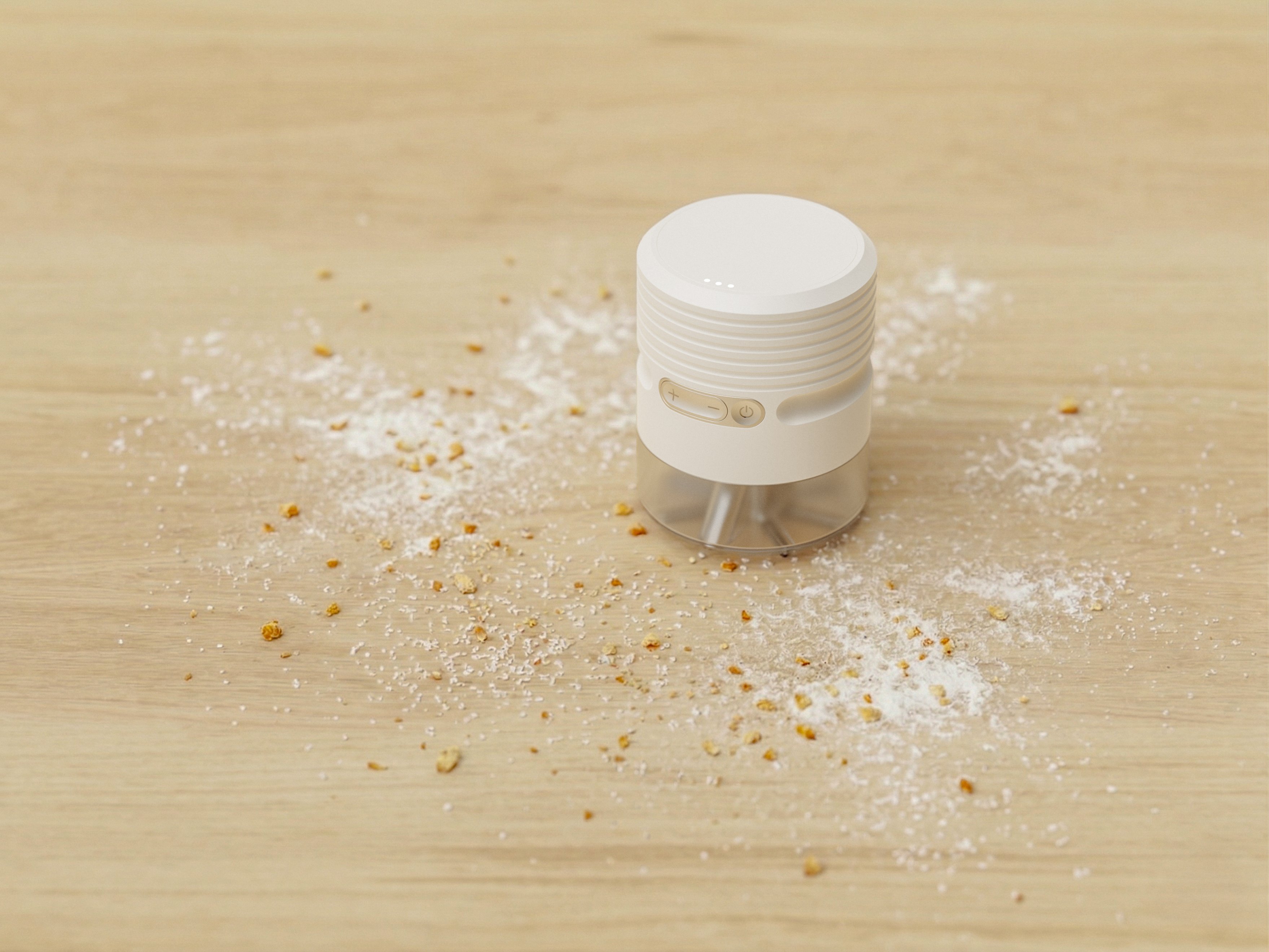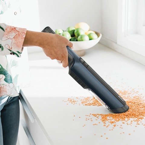a kitchen vacuum designed to quickly remove fine powders and crumbs from countertops, featuring a wide head, intuitive wiping grip, and a form that blends seamlessly into the kitchen.